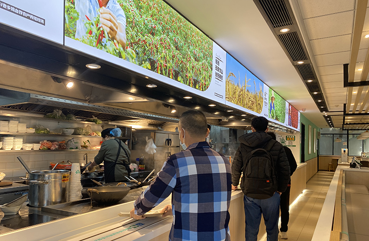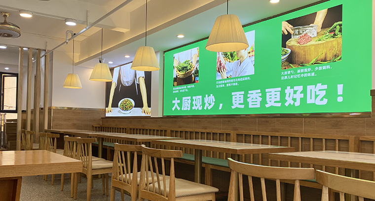 為了使門店效果最大化,在立面的墻面上可以做一些精美的廣告燈箱畫面,超薄軟膜燈箱,用一些高精度的精美大圖,內(nèi)容或與品類相關(guān),或與品牌文化有聯(lián)系,或是表現(xiàn)菜品核心特色。讓顧客在用餐之余,還能欣賞并閱讀我們的產(chǎn)品。