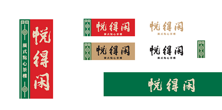 因此,悅得閑的logo我們使用圖形加文字的形式。大紅色的底色上用金色的品牌字,傳遞一種茶樓出品的品質(zhì)感,表示金字招牌之意。左側(cè)綠色色塊上一個(gè)原創(chuàng)圖形,取自于得閑飲茶的閑字,將閑字變形,用點(diǎn)心蒸籠的圖形填充,表明了品類(lèi)屬性也傳達(dá)了得閑飲茶的文化IP。