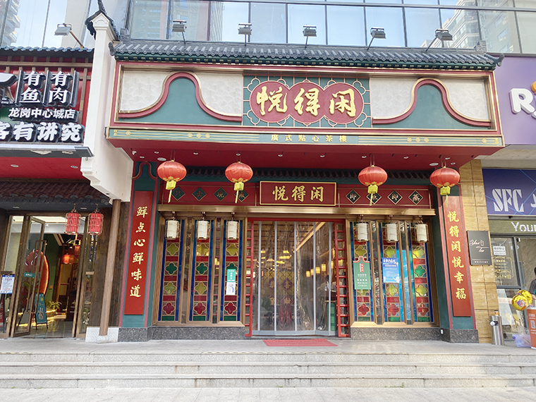 悅得閑-廣式點心茶樓,品深在策劃時將其定位為一家經典時尚的廣式點心茶樓。門頭色彩搭配、對聯、玻璃窗花都用了廣式元素,并大膽使用紅綠兩色撞色搭配,形成品牌記憶點。