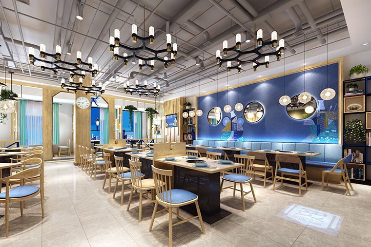 品深餐飲設計在整個空間裝飾設計中,我們貫徹“讓消費者能放松心情,享受美食,有情懷,有情調,有趣味”。通過空間中大面積天空藍的使用,與我們傳達的新鮮,干凈、現拌的出品特質完美契合,使用藍色刻意營造舒適,純凈的用餐氛圍;