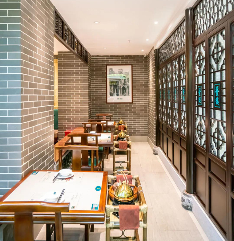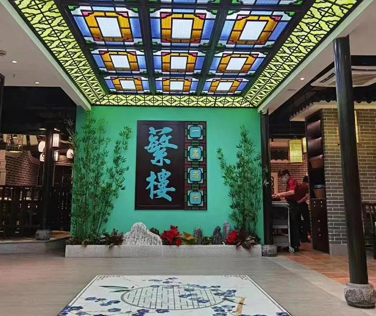 在空間裝飾上,堅(jiān)持將傳統(tǒng)嶺南建筑常用的鑊耳山墻、滿洲窗、廣州老建筑的趟門,具有鮮明地域特色的西關(guān)大屋,廣府人最熟悉的雞公欖,在空間中靈活使用,達(dá)到了一種步移景異,一步一景的空間效果。