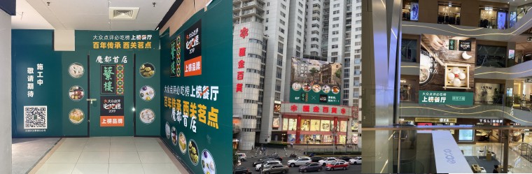在商場外部廣告宣傳方面,品深餐飲設(shè)計(jì)在商場一樓大廳的羅馬柱、商場正面戶外大廣告畫面。重點(diǎn)突出品牌名稱、產(chǎn)品特色,讓周邊街坊、地鐵進(jìn)出站乘客抬眼就能看到我們;商場