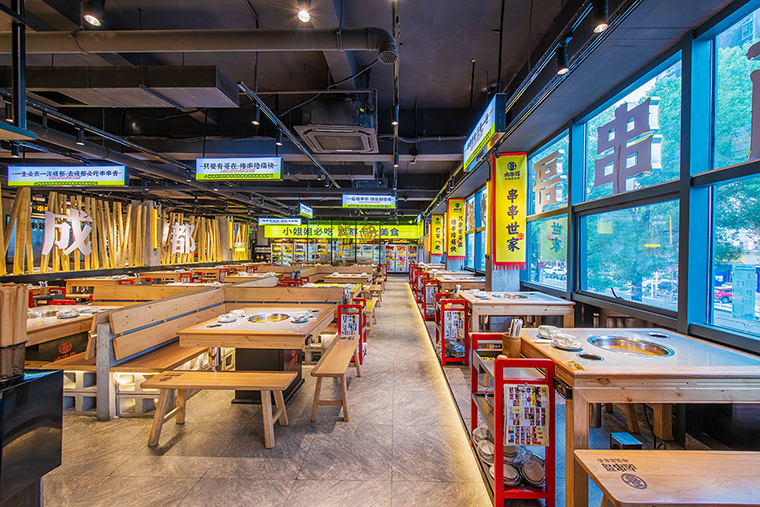 在空間中,我們用鹵串哥品牌強關聯的具體一個竹元素串聯整個裝飾,形成品牌專屬識別記憶,并與串串香的竹簽子,竹椅相呼應,既有品類特征,又是品牌文化的經典傳達。